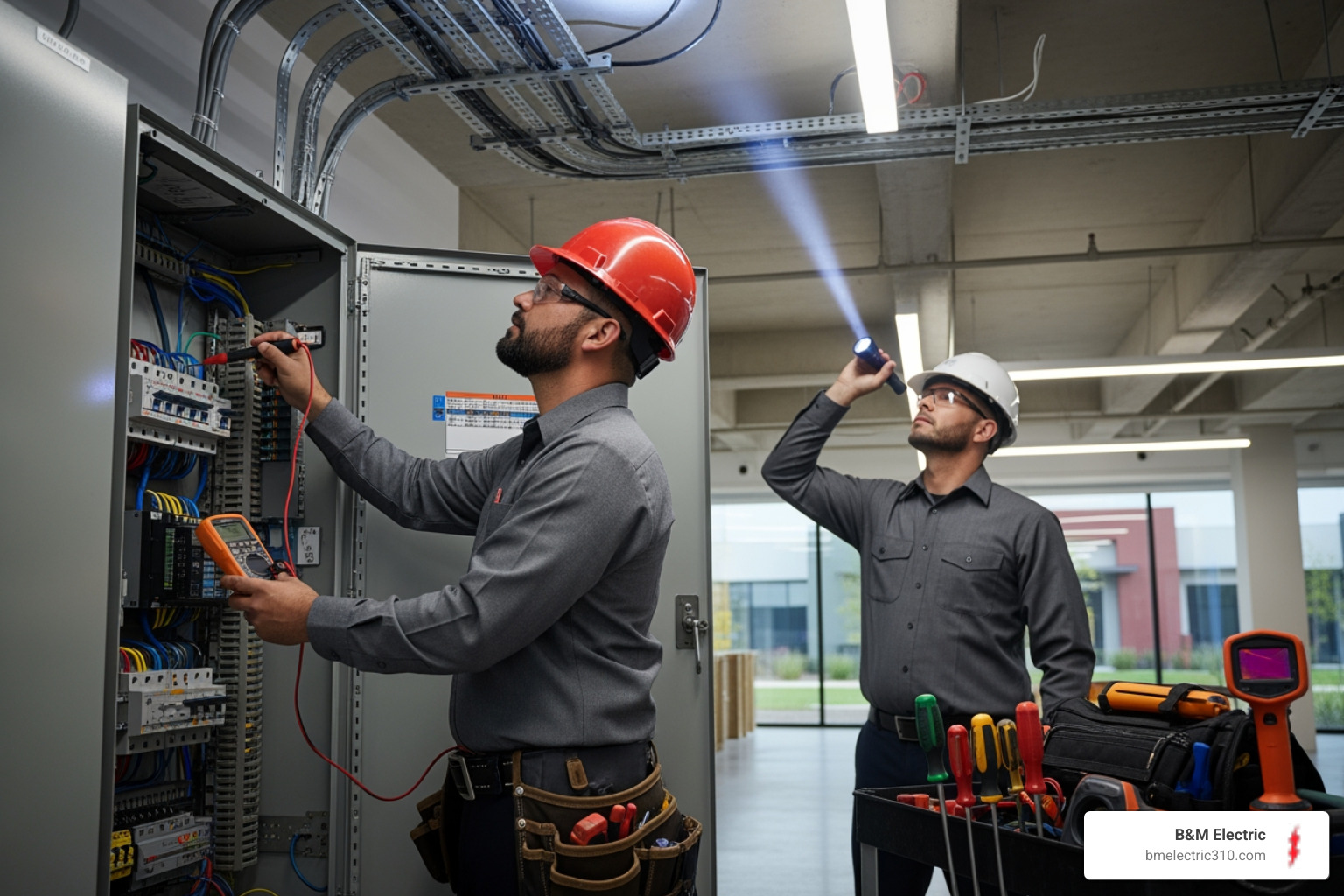 At B&M Electric, with our 50 years of local expertise, we understand the unique electrical demands and regulatory landscape of commercial properties in Torrance, CA. We believe that a professional commercial electrical inspection in Torrance, CA is more than just a service; it’s a proactive investment in your business’s long-term safety, efficiency, and continuity. Our licensed electricians bring precision, care, and a personal touch to every inspection, ensuring you receive a thorough assessment and clear, actionable recommendations.