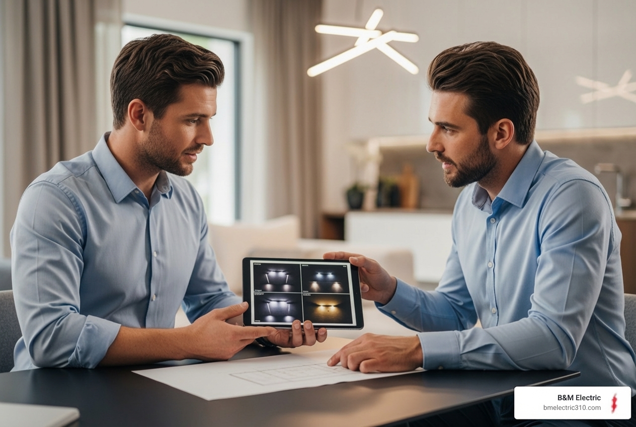 Answering Questions: We encourage you to ask any questions you have about lighting types, smart home integration, energy efficiency, or our installation process. We’re here to provide clear, understandable answers.